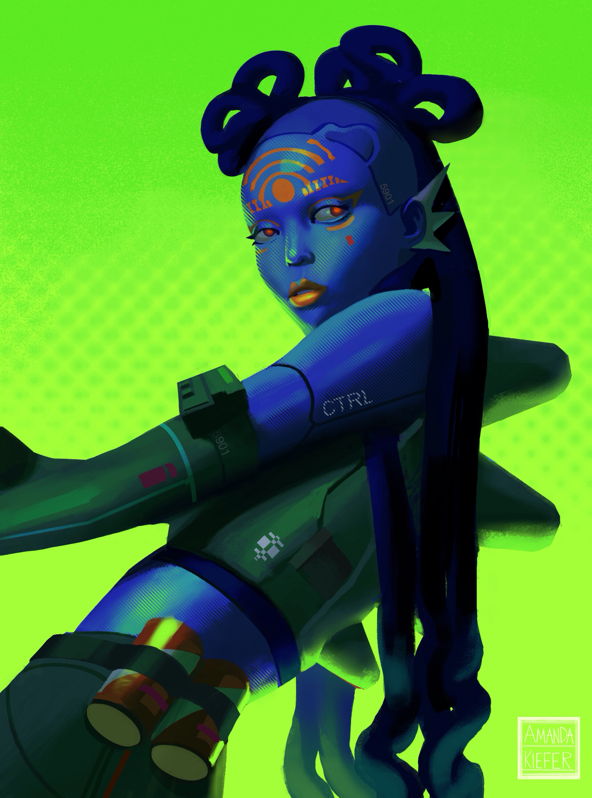 | Physical Description | A sophisticated synthetic shell with a deep blue, matte skin etched with fine, silver filigree. Her hair is permanently braided into smooth tubes of silicone, and her optical sensors are a soft, observant red. |